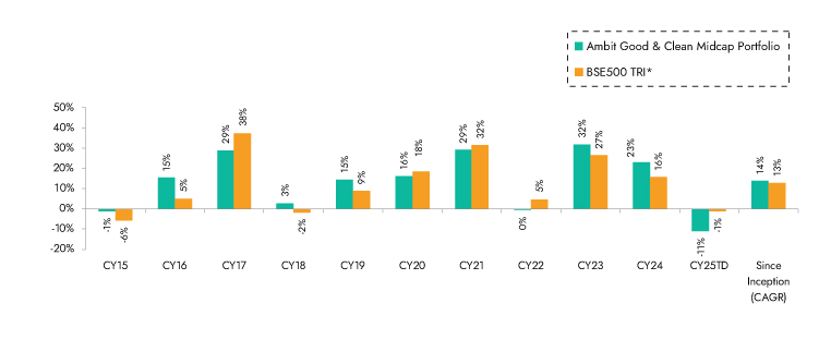 Ambit Good & Clean Mid cap Portfolio inception date is Mar 12, 2015; *BSE 500 50 TRI is the selected benchmark for the Ambit Good & Clean Mid cap. The same is reported to SEBI.