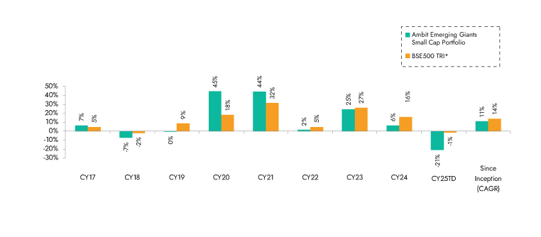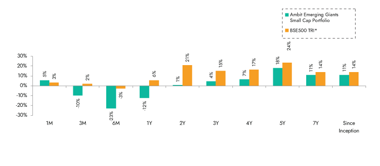 Source: Ambit Emerging Giants Small cap Portfolio inception date is Dec 1, 2017; *BSE 500 TRI is the selected benchmark for the Ambit Emerging Giants Small cap. The same is reported to SEBI.