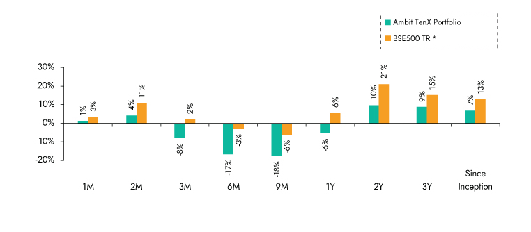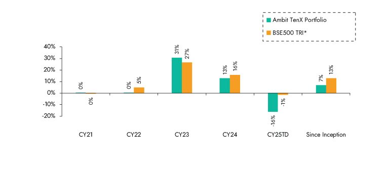 Source:Ambit TenX Portfolio inception date is Dec 13, 2021; *BSE 500 TRI is the selected benchmark for the Ambit TenX Portfolio. The same is reported to SEBI.