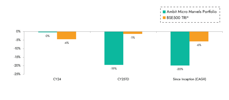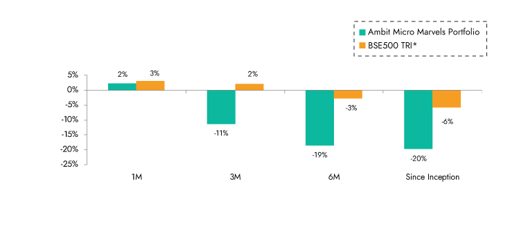 Source: Ambit Micro Marvels Portfolio inception date is Jul 29, 2024; *BSE 500 TRI is the selected benchmark for the Ambit Micro Marvels Portfolio. The same is reported to SEBI.