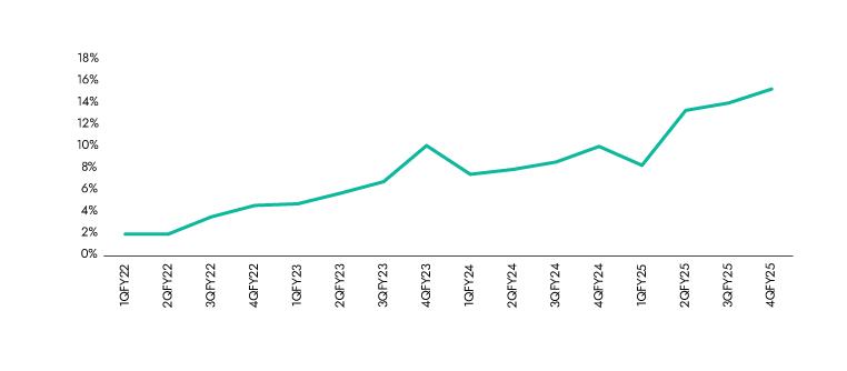 Despite its early success, QC accounts for only 6% of India’s estimated US$ 63 bn total addressable market (TAM), highlighting significant headroom for growth. TAM is expected to grow at a 22% CAGR over FY24–30E, while QC GOV is projected to rise at a 36% CAGR to reach US$ 25 bn by FY30E. This growth will be driven by deeper penetration, expansion into new categories (beyond food and grocery), and increasing relevance in Tier-1 cities.