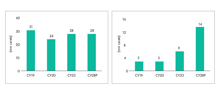 In CY23, global cut and polished diamonds (CPD) demand for jewelry was ~34 mn carats, with ~28 mn natural and ~6 mn LGDs. Over CY23–28P, natural diamond supply is expected to remain flat, while LGDs are projected to grow at an ~18% CAGR.