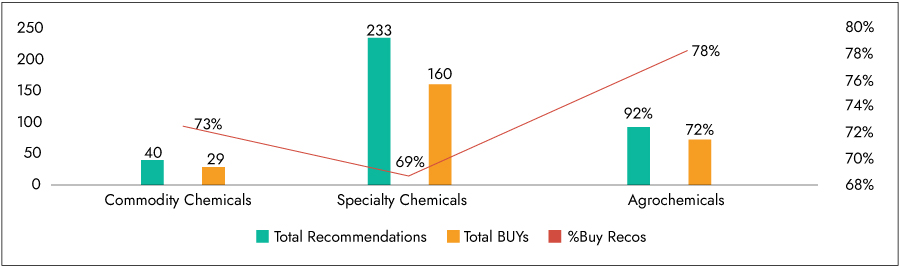 Street community got exited on the back of chemical companies reporting good results and this led to several upgrades to the sector. Street started extrapolating the record margins to FY22-25 period as well and resultantly the sector saw ~73% buys and outperformer ratings; coverage for chemical companies also started rising significantly.