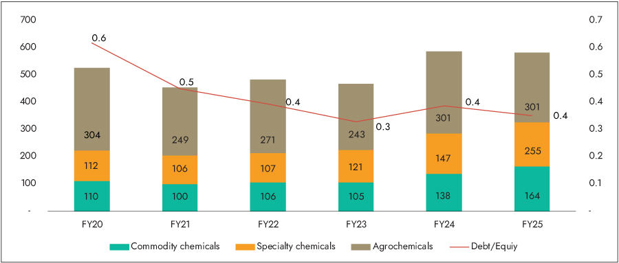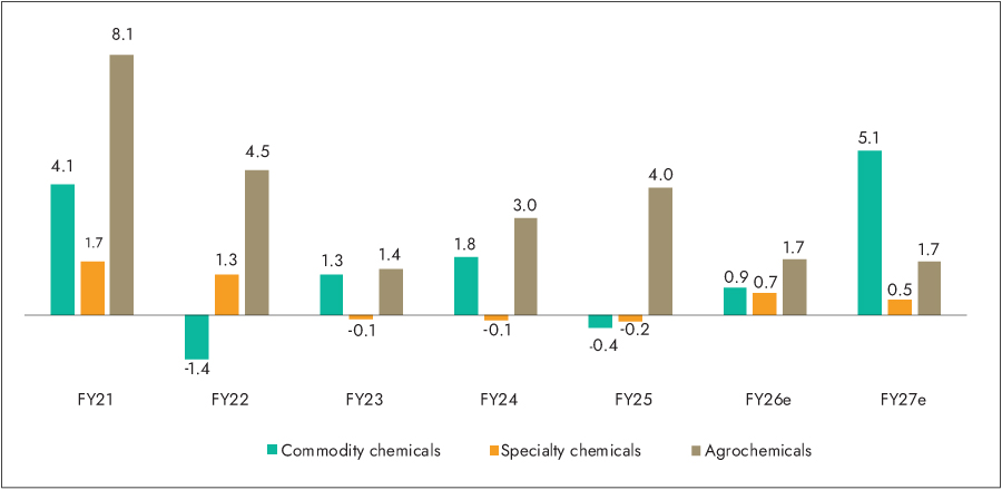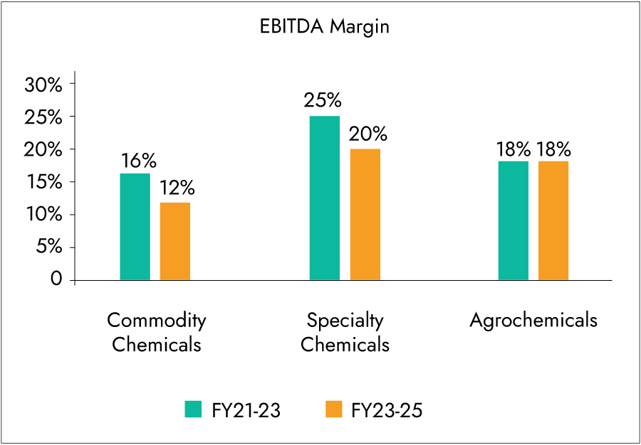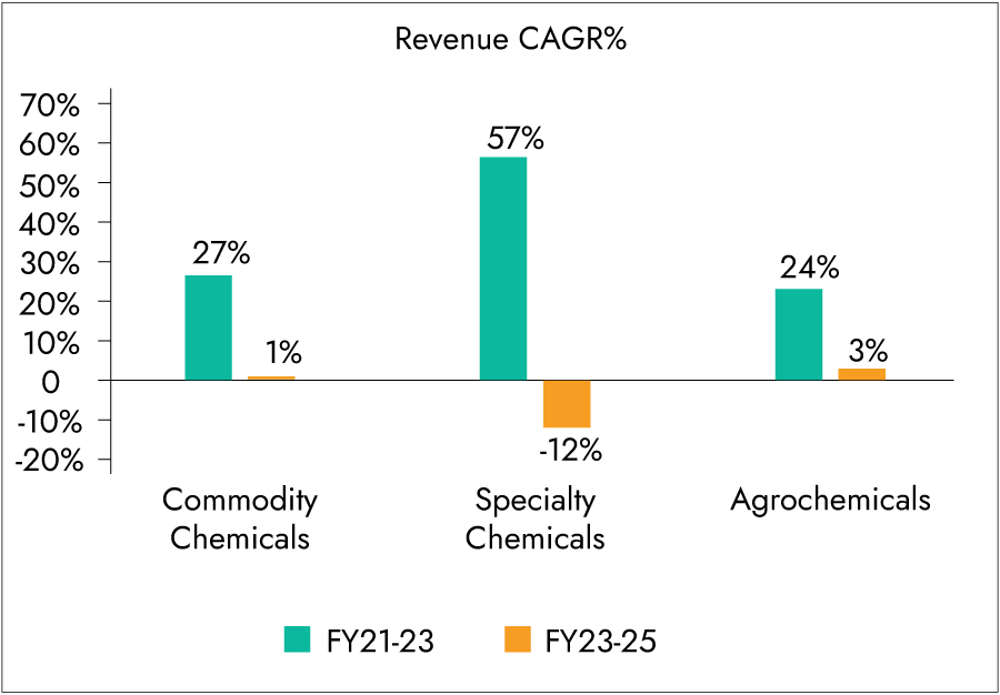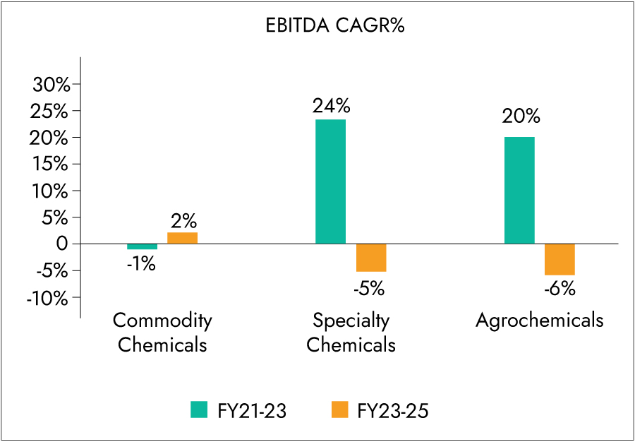 FY24-25 period saw significant deceleration in both revenue and EBITDA CAGR across several sub-sectors of chemicals when compared to the golden period of FY21-23; during FY23-25 the revenue CAGR was just 1% in commodity chemicals/ -12% in specialty chemicals and 3% in agrochemicals segment while EBITDA CAGR was 2%/-5% and -6% in respective sub-segments. EBITDA margin contraction was ~500bps across 3 sub-segments to average of 14% vs 19% in FY23. The sector did exceptionally well during the golden era of FY21-23 as revenue CAGR was 27% in commodity chemicals/ 57% in specialty chemicals and 24% in agro segment. The worst sub-sectors during FY23-25 were Amines which reported revenue/EBITDA CAGR of -14%/-26% vs the golden era CAGR of 26%/9%, Alkali chemicals -10%/-32% revenue and EBITDA CAGR over FY23-25 vs 36%/64% CAGR over FY21-23 and oleochemicals 39%/47% vs -7%/-16% CAGR.