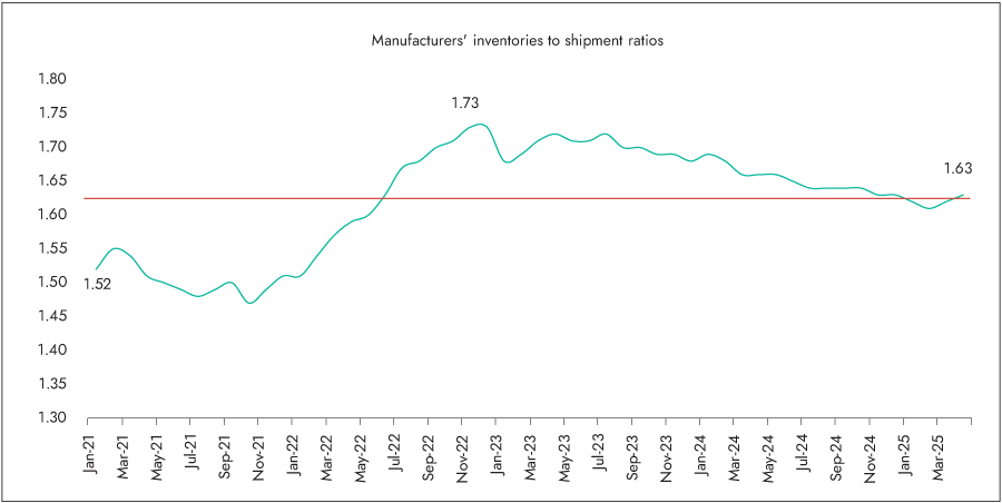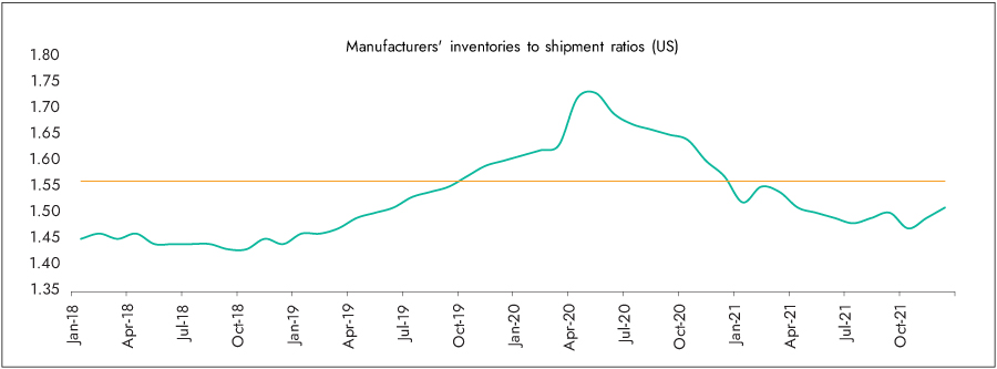 Exhibit 7: Covid and De-stocking saw global inventory rising to record levels as manufacturers' inventories to shipment ratio peaked in 2020