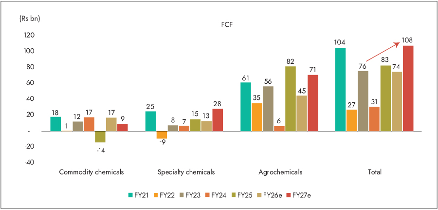 - FCF to see significant growth over FY25-27 despite some pick-up in capex over FY26-28 on import substitution, CDMO and export opportunities: Companies have consistently added new product capabilities to maintain their growth aspirations. The capex of Rs89bn in FY21 over 36 companies rose to Rs133bn in FY22 and Rs167bn in FY23. The capex intensity subsequently declined to Rs142bn in FY24 and Rs148bn in FY25 due to uncertain demand and pricing environment. We expect capex to revive again from FY26 with focus on rising export and import substitution opportunities. The new products are forward-integrated into the existing product portfolio, such as fluoropolymers for SRF, phenol/acetone downstream for Deepak Nitrite, chloro-toluene value chain for Aarti Industries antioxidants for Vinati, etc. Companies like PI and SRF are also building on their capabilities to venture into new categories like pharma CRDMO, API and intermediates. We expect these companies to continue to build on their capabilities given: a) customer relations, b) global footprint, and c) operational track record supported by sound balance sheets. They will continue to leverage their learning of the last two decades and increase their wallet share in export markets. They will continue to attract new business given their operational delivery and process capabilities supported by R&D.