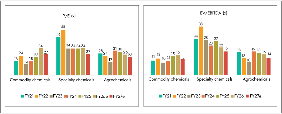 Exhibit 5: Valuation also saw significant de-rating with P/E and EV/EBITDA multiples correcting by ~13% to ~10% across sub-sectors, majorly in spechem