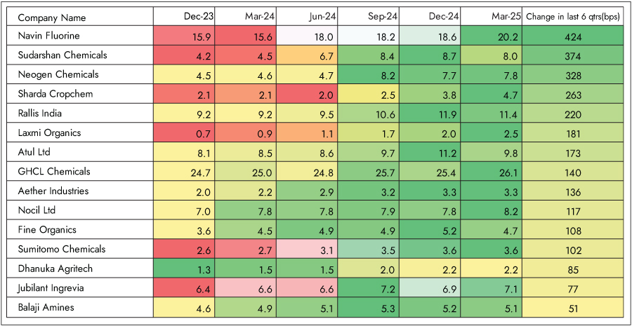 Exhibit 20: DIIs shareholding (%) in chemical sectors has been going up now for 6 quarters (Top 15 companies seeing this trend)
