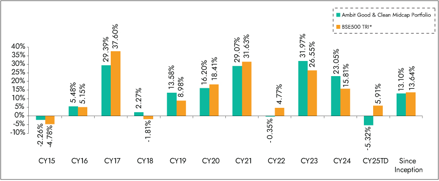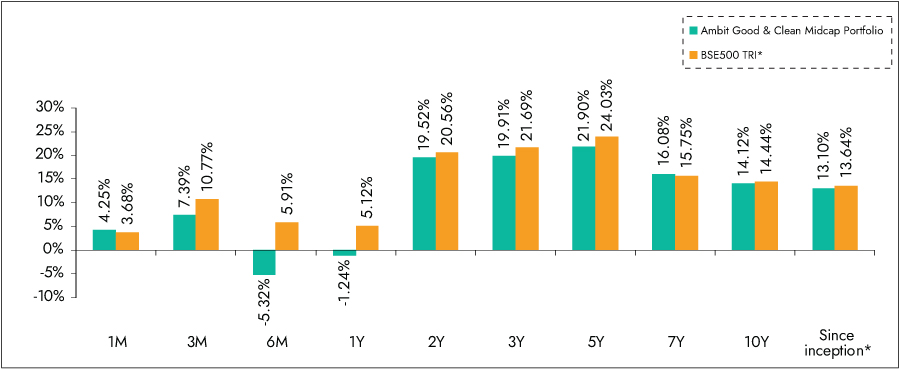 *BSE 500 TRI is the selected benchmark for the Ambit Good & Clean Mid cap. The performance related information provided herein is not verified by SEBI.