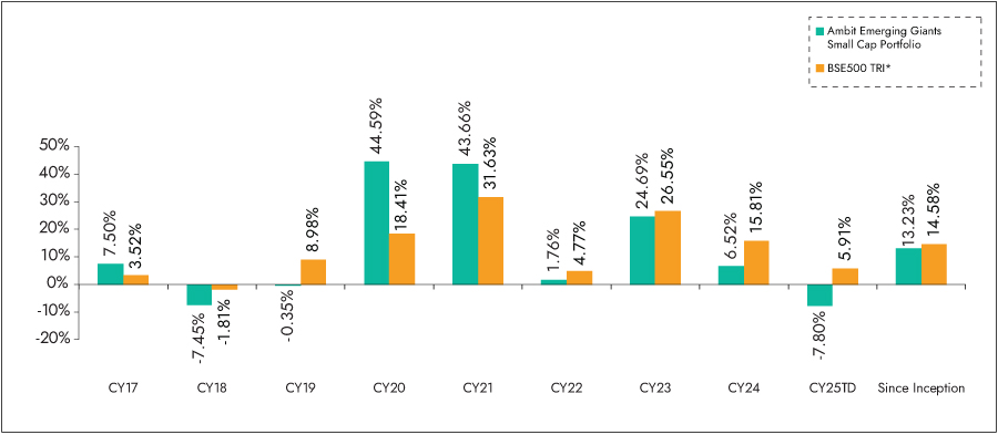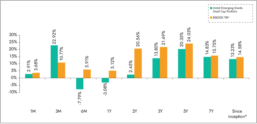 Source: Ambit Emerging Giants Small cap Portfolio inception date is Dec 1, 2017;