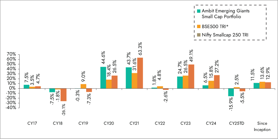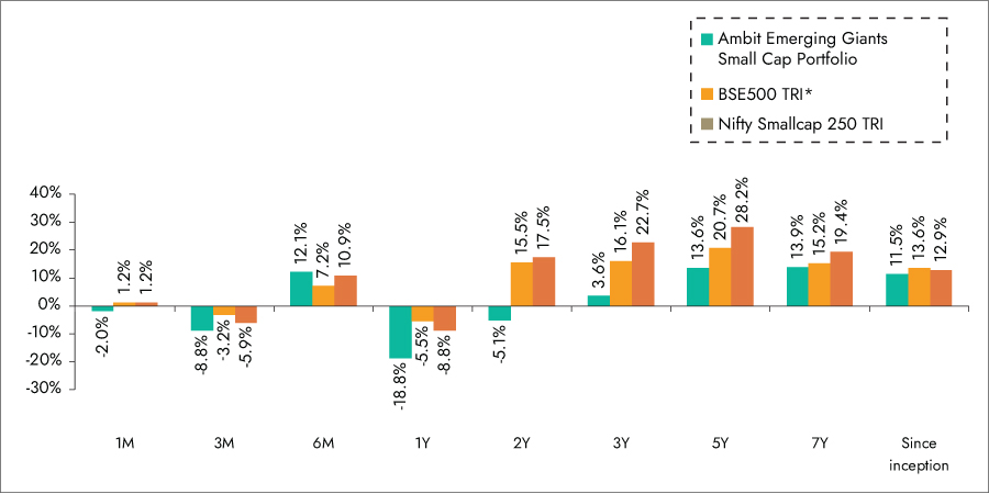 Source: Ambit Emerging Giants Small cap Portfolio inception date is Dec 1, 2017;