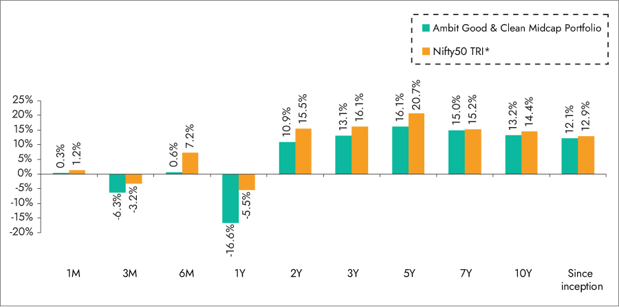 *BSE 500 TRI is the selected benchmark for the Ambit Good & Clean Mid cap. The performance related information provided herein is not verified by SEBI.