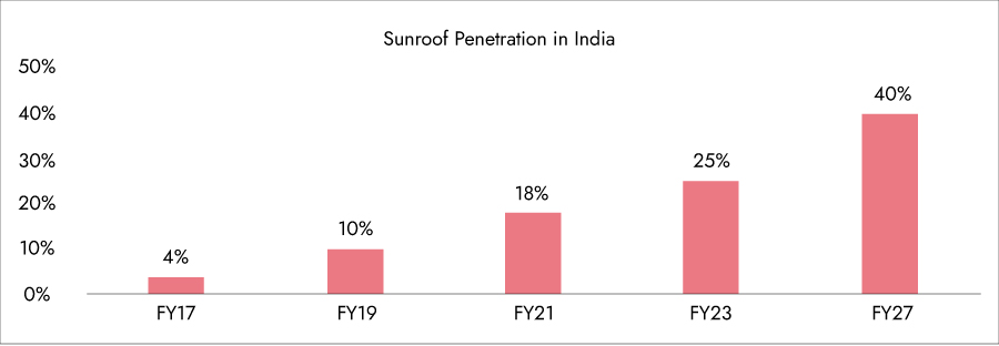 - Several existing cars have seen significant upgrades post rise in localization: Indian car customers have shifted significantly from prioritizing only fuel efficiency (“Kitna deti hai?”) to demanding advanced technology and features (“Features kya hai?”) along with increasing focus on safety. There are several case studies of existing cars seeing a significant upgrade in features post their rising localization. Post the localization in sunroof manufacturing and components for ADAS, we have seen several existing cars getting re-launched with embedded ADAS technology and sunroof. Sunroofs started getting manufactured in India in FY22 by companies like Webasto and Gabriel India and this became the inflection point for the rise in penetration of cars with sunroofs.