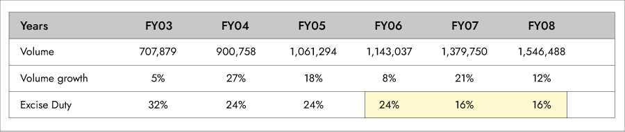 To assess the impact of price cuts on demand we go back to the early 2000’s where we saw excise duty cut playing out in the PV segment. In FY04 and FY05, car volumes grew 28% and 18%, respectively after excise duty was reduced from 32% to 24% in FY04. Similarly, the industry grew 21% and 12% in FY07 and FY08 when excise duty on small cars was reduced from 24% to 16% in FY07.