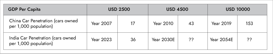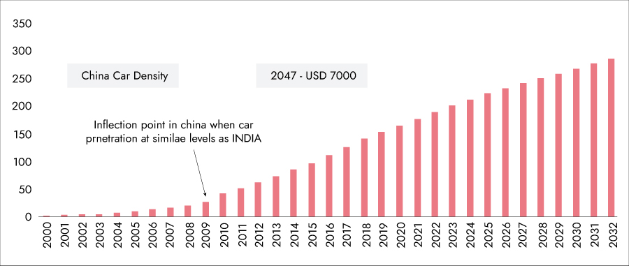 Chinese auto penetration increased significantly post its per capita income reaching USD 2,500